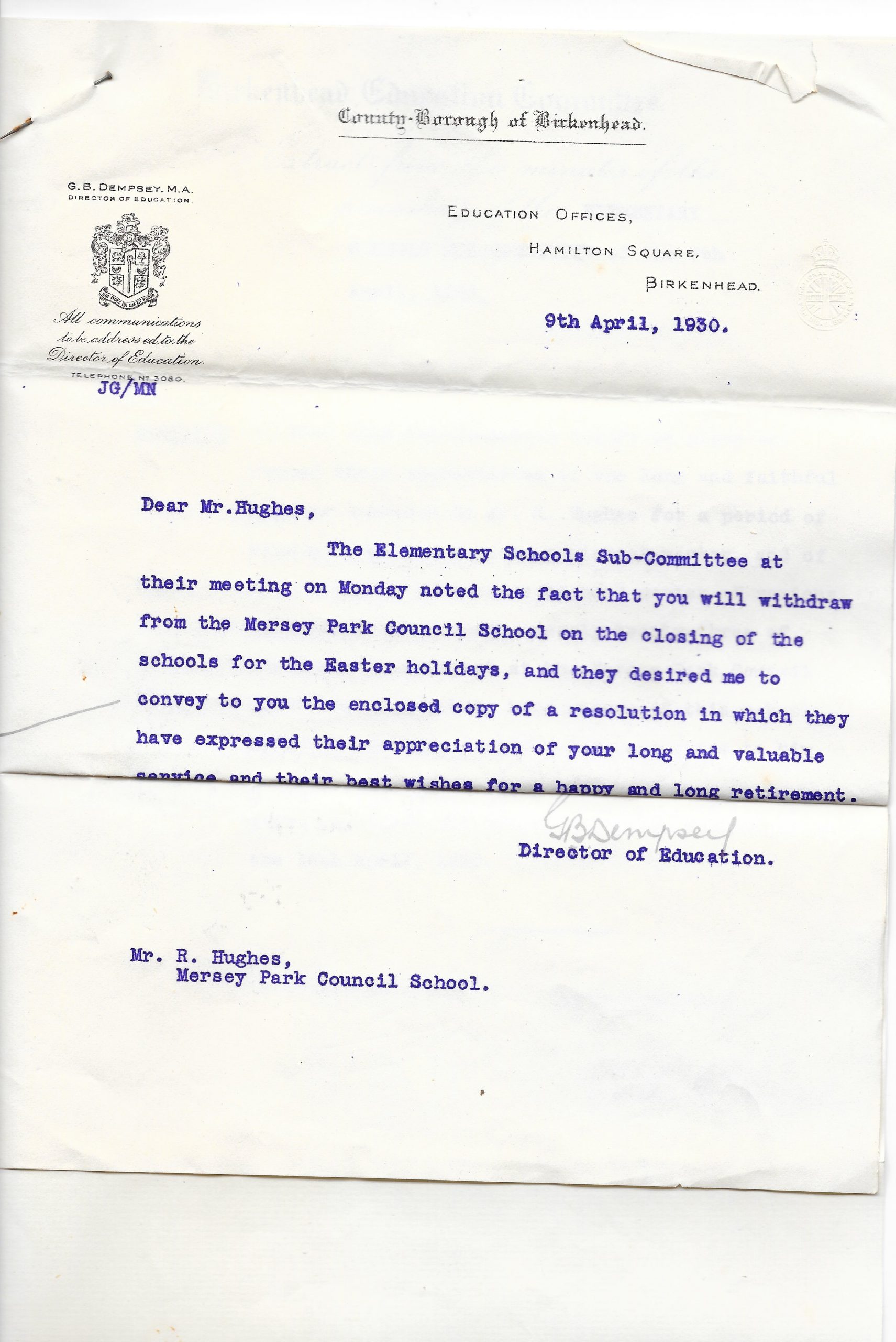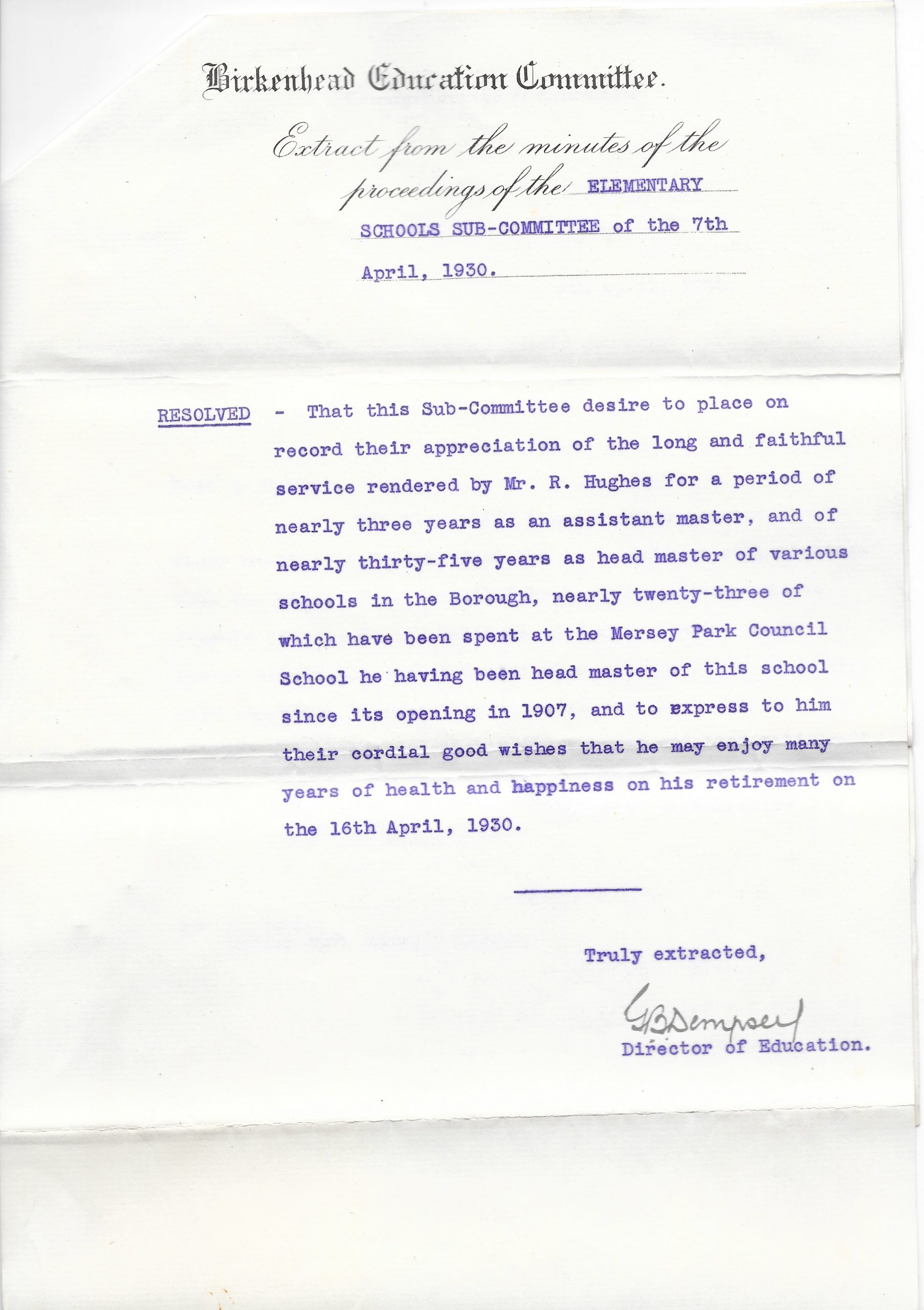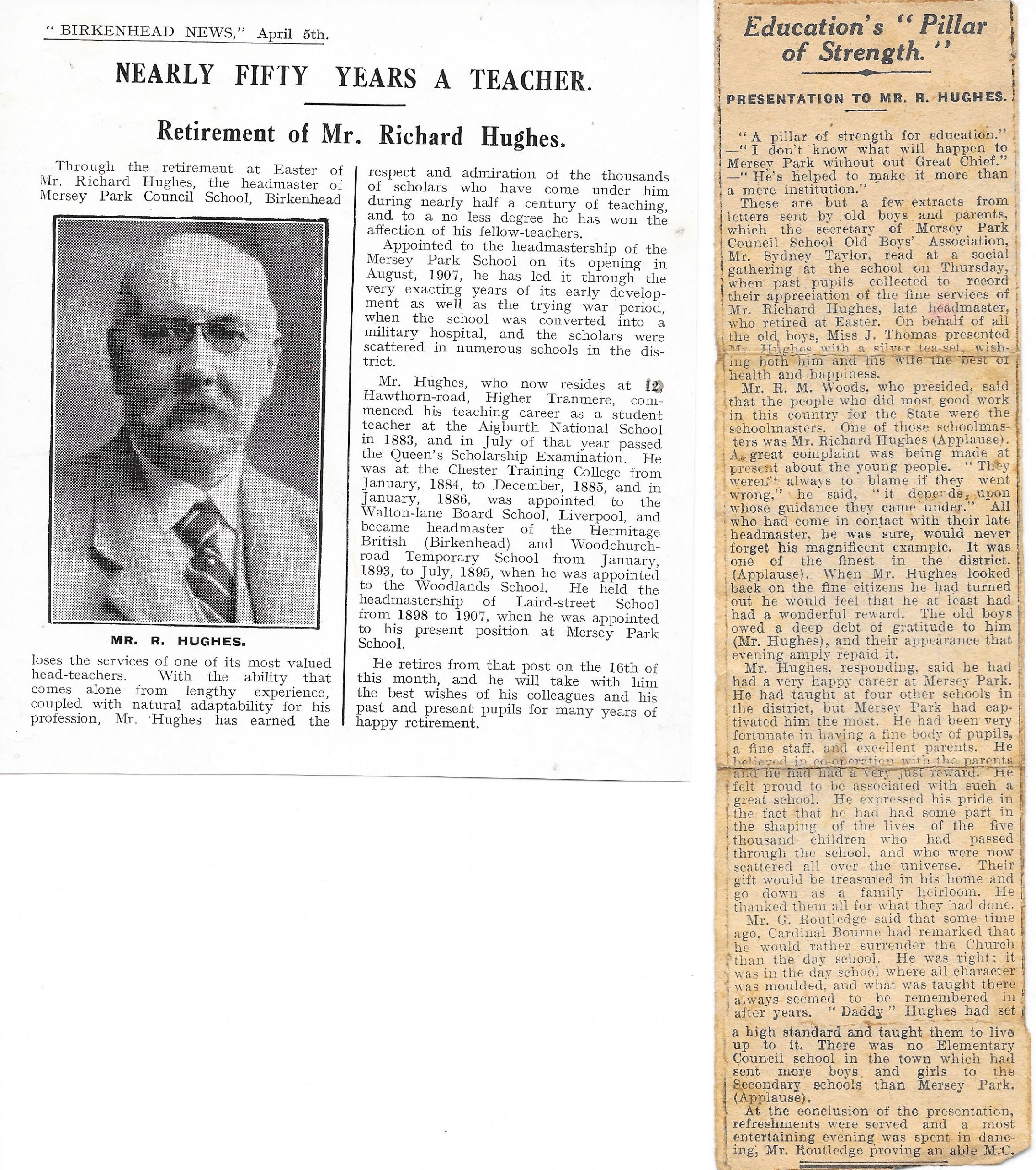 Retirement notice- retirement of Headmaster at Mersey Park Council School, Mr. Richard Hughes. Headteaher from 1907- 1930